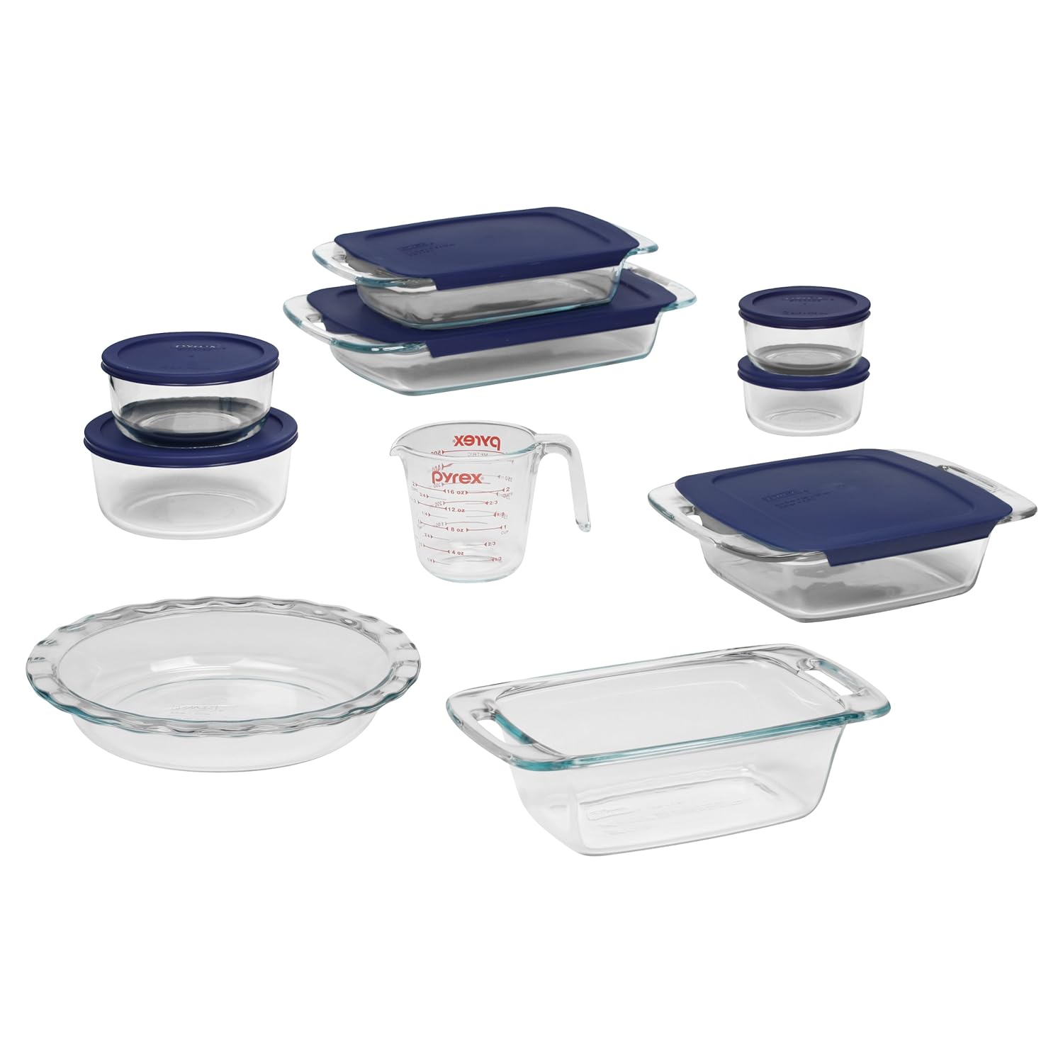Pyrex glass bakeware/cookware is a must have for any serious kitchen. Available in an array of functional shapes and sizes, each individual piece can be used for baking, cooking, microwaving, serving, and storage. This set 17 piece set includes: 1-2-quart Oblong with Blue Plastic Cover;1-3-quart Oblong with Blue Plastic Cover; 1-8-inch Square with Blue Plastic Cover; 1-1.5 Loaf; 1-9.5-inch Pie Plate; 1-1 Pint Measure Cup; 2-2 Cup Round Measure Bowl with Blue Plastic Cover;1-4 Cup Round Measure Bowl with Blue Plastic Cover;1-7 Cup Round Measure Bowl with Blue Plastic Cover.
